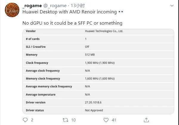 關(guān)于華為電腦的資料目前媒體們所知不多。有一位海外推主曾經(jīng)拿出過一份配置資料:顯示華為臺式機(jī)搭載了Ryzen 5 PRO 4400G 處理器,612線程,基礎(chǔ)頻率3.7GHz,最高頻4.3GHz。