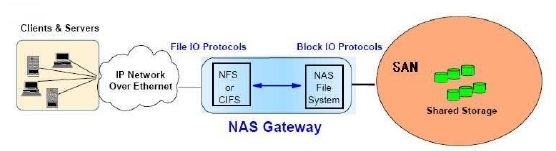 “NAS網(wǎng)關(guān)”方案主要是在NAS一端增加了可與SAN相連的“接口”,系統(tǒng)對(duì)外只有一